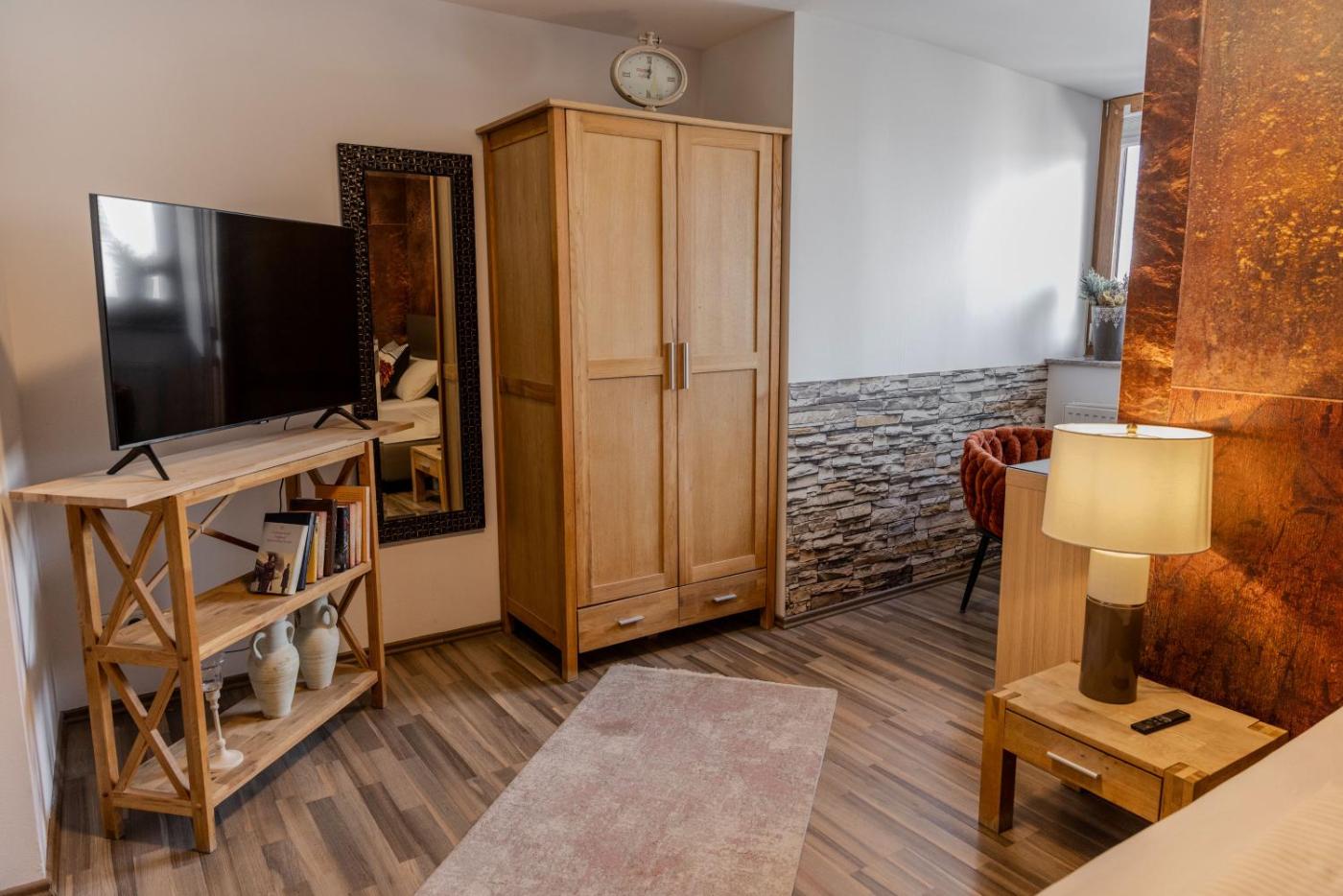Doppelzimmer mit Gemeinschaftsbad. Providing free toiletries, this double room includes a shared bathroom with a hairdryer. The double room provides a flat-screen TV, a tea and coffee maker, a dining area, a wardrobe as well as city views. The unit offers 2 beds. ;